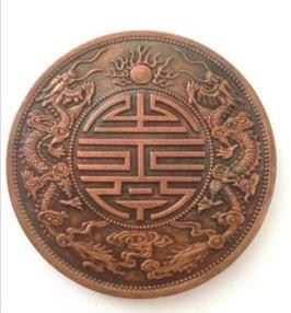 双龙币有两种版式,即库平重一两币和库平七钱二币,两种版式的钱币设计风格一样,但是在细节上有很多区别。本品为库平七钱二的版式,由于广东省当时铸造此币的目的是奉献清廷以祝慈禧太后万寿,所以铸额不大,大多奉献给清廷或赠于当时的达官显贵,见于民间流通的很少。此币正面珠圈外上端镌“广东省造”四字,下方为“库平七钱二”五字,左右两侧各铸一蝙蝠图案,珠圈内铸满、汉文“光绪元宝”四字;背面珠圈外铸有双龙图案,里面铸有一圆形“寿”字。赶_驴_网赶~驴~网