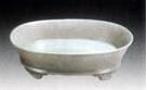 汝窑青釉水仙盆,高7.2cm,口径25.4x16.5cm赶驴网www.ganlv5.com。敞口,斜壁,椭圆形大平底,下承四片足赶驴网www.ganlv5.com。传世的5件珍品分别藏于台北故宫博物院和日本大阪市立东洋美术馆赶~驴~网