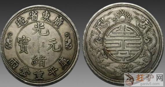 广东造双龙寿字币,由于广东省当时铸造此币的目的是奉献清廷以祝慈禧太后万寿,所以铸额不大,大多奉献给清廷或者赠予当时的达官显贵,见于民间流通的很少。该银币正面珠圈外上端镌刻“广东省造”四字,下端镌刻楷书“库平七钱二”五字,左右两侧各镌有蝙蝠图案,珠圈内铸有“光绪元宝”四字。银币背面珠圈外铸双龙戏珠图案,珠圈内铸一圆形“寿”字赶.驴.网。银币设计极具特色,正面两侧所铸的一对蝙蝠图案寓意吉祥。因蝙蝠的“蝠”字与“福”字谐音,在币面上铸蝙蝠图案意在取“蝠”、“福”两字谐音,与背面的“寿”字相对应,寓意“福寿双全”。迄今历朝铸造的银、铜币没有哪一种可以与广东省造寿字七钱二相比赶~驴~网。一方面该币几乎每一笔笔画镌刻以及纹饰均难以模仿;另一方面银币背面双龙刻画的栩栩如生,令人叹为观止,是十分优秀的盘龙浮雕作品。