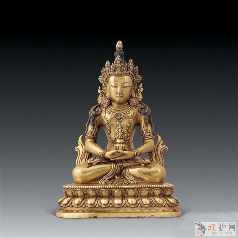 鎏金铜佛像为释迦牟尼铜坐像,束发式肉髻,着佛头青色欢迎www.ganlv5.com。通体鎏金,双目微闭,两耳垂肩,结跏趺坐,施降魔印,着轻薄贴身的袈裟,露右肩。身材比例协调、造型优美赶驴网www.ganlv5.com。