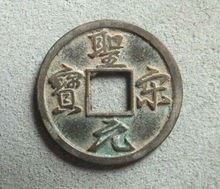 圣宋元宝,中国古代钱币之一g~a~n~l~v~5~c~o~m。宋徽宗赵佶建中靖国元年(公元1101年)始铸,是仁宗“皇宋通宝”之后又一种不以年号命名的非年号钱。“圣宋元宝”钱有小平,折二对钱多种。钱文以篆书、行书两种书体书写、字多变化,皆为旋读。