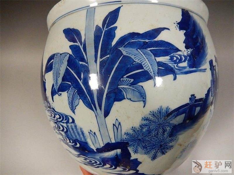 嘉靖时期官窑瓷器有两个显著特征,一是纹饰多具有道教色彩,二是大件器物日渐增多,有大龙缸、大罐、葫芦瓶、大盘等,但修胎较粗糙。瓷缸多绘龙纹,故有“大龙缸”之称,龙缸一般形制较大,胎体厚重,在烧制过程中使器物不变形,需要很高的成型工艺和烧造技艺。目前所见,宣德时期的青花龙缸为早的实物,嘉靖时期的制品较多见,有青花、五彩品种,装饰纹样有云龙、龙凤、鱼藻、荷莲、婴戏图、缠枝莲纹等。此缸形体较大,胎体厚重,青花色泽浓艳,绘制笔法奔放活泼,以重色绘莲花,衬以疏密有致的枝叶,连绵不断,象征着“圣洁”,寓意着吉祥。原文www.ganlv5.com