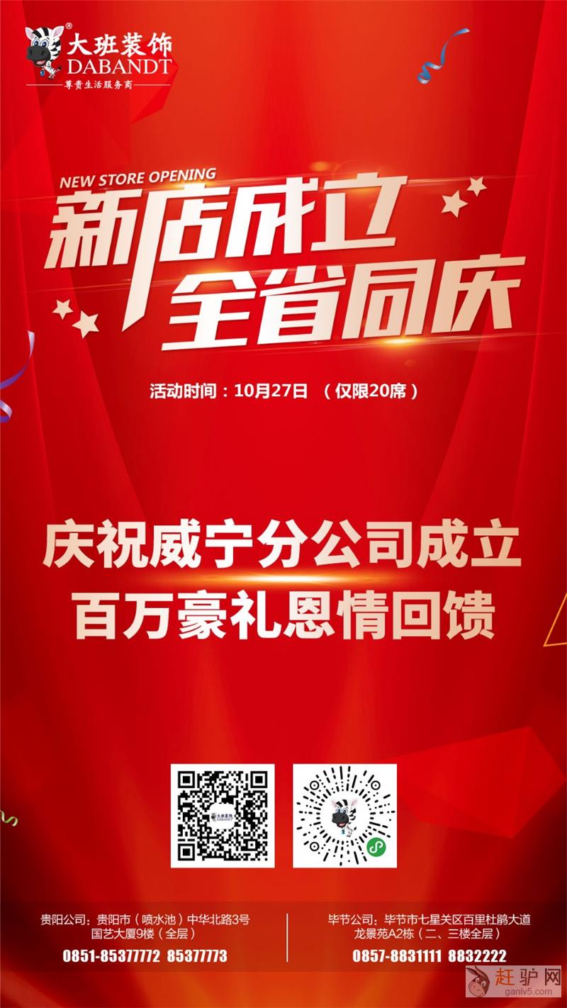 为庆祝威宁分公司成立,这个周末10月27日,大班装饰联合贵州电视台家园栏目共同举办装修特惠活动,总部特批百万豪礼恩情回馈,让装修直省30%g+a+n+l+v+5+c+o+m。借此活动,我们特别邀请贵州电视台家园主持人盛兰来指导您的爱家装修,让您装修少花冤枉钱而且能得到不一样的装修效果及尊贵生活服务体验!本次活动全省限量60套,贵阳限量20套,数量有限,时间有限,定完即止wRas。